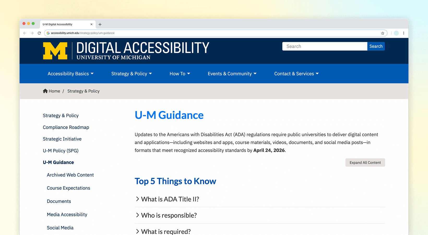 U-M Digital Accessibility website showing current ADA Title II guidance.