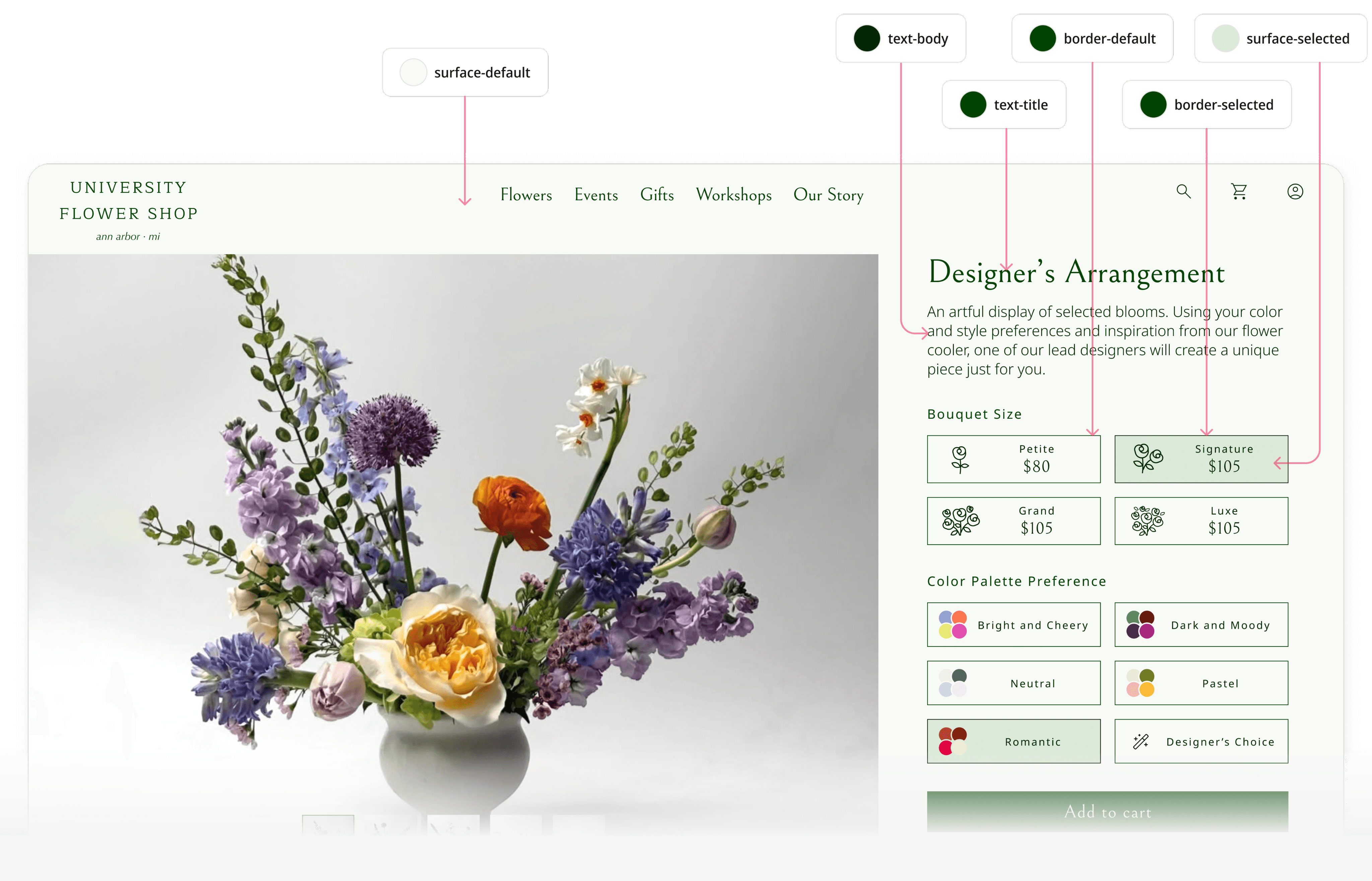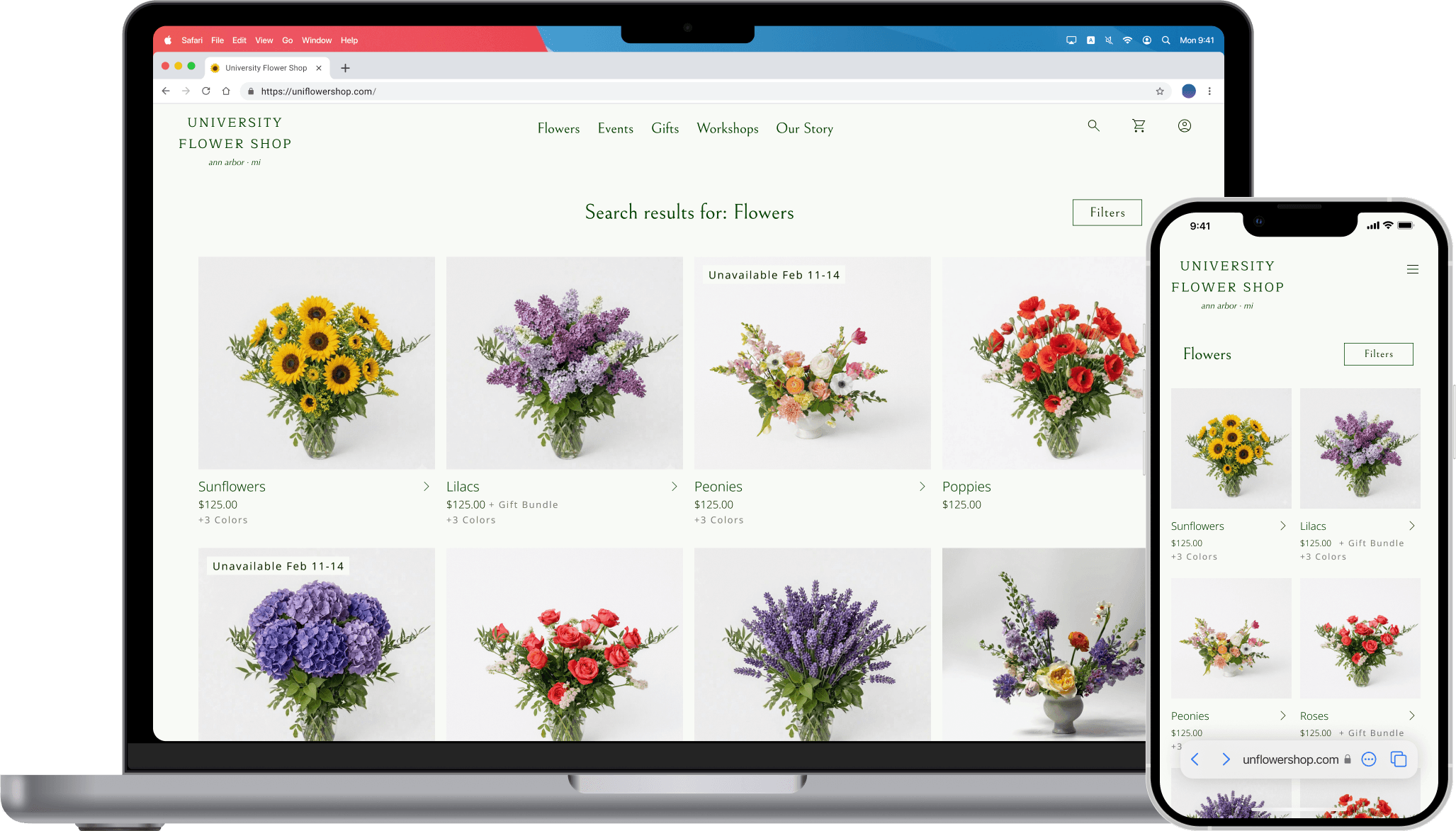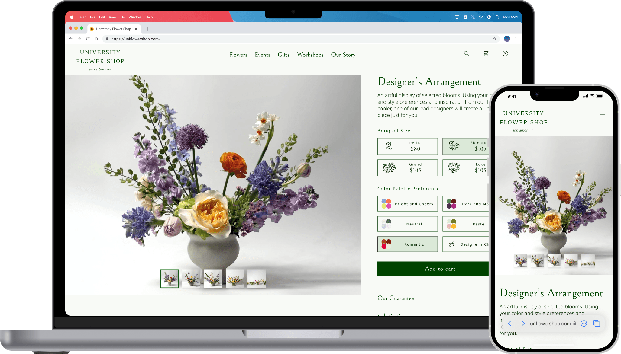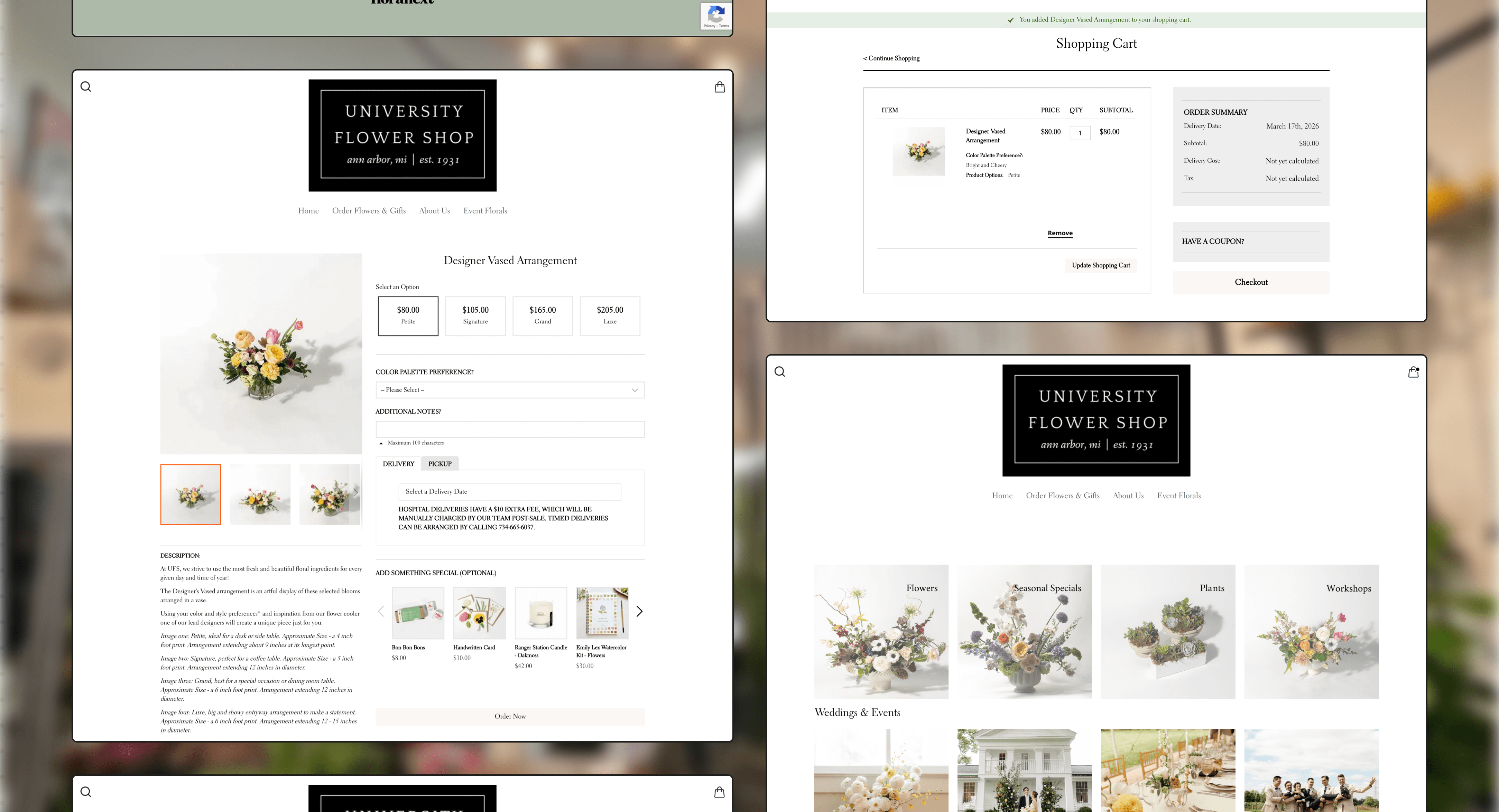 The current site was evaluated against accessibility and usability heuristics, and analyzed a range of florist and e-commerce sites to identify patterns in how similar businesses serve younger demographics online.